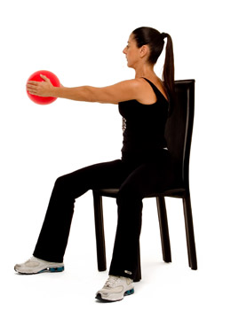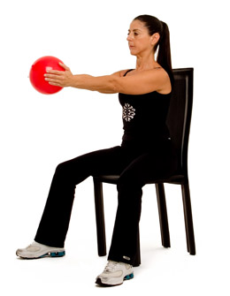 Start seated in a chair with your back supported. Hold a ball with both hands away from you, at chest height.