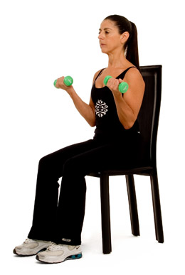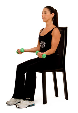 Start sitting in a chair with your back supported. Hold small weights in both hands, arms parallel to the ground, elbows flexed at 90 degrees.