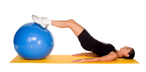 Increase the degree of difficulty another notch. Keep the palms down on the mat. Rest your feet on the ball, raise your hips, but hold the knees semi-flexed. Contract the abs and butt for 1-2 seconds, just enough to lift your hips a couple of inches further; relax and lower the hips a couple of inches without changing your stance. Repeat 10-20 times.