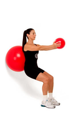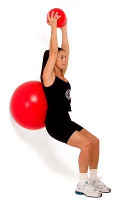 Make the routine more difficult by keeping your knees bent to 90 degrees while holding the ball in front of you. If your initial posture gainst the wall is correct, your knees won't travel further than your ankles.