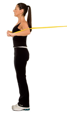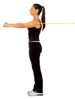 Proceed to stretch your arms forward holding them horizontally in a smooth motion. Resume the starting position. Repeat 10-20 times.