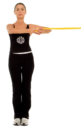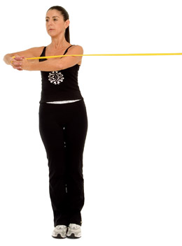 Proceed to pull the bands to the opposite side, keeping them at chest level. Resume the starting position. Repeat 10-20 times each side.