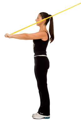 Proceed to stretch your arms out horizontally, in a smooth motion. Resume the starting position. Repeat 10-20 times.