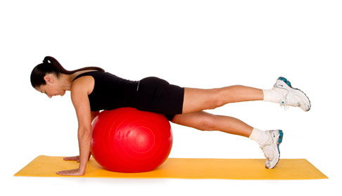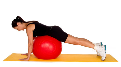 Start by resting the abdomen on the ball with your hands on the mat and both legs straight, feet on the ground.