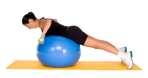 Start with your legs stretched, toes on the floor and resting your abdomen on the ball. Hold small hands weights down on the mat. Keep your back straight.