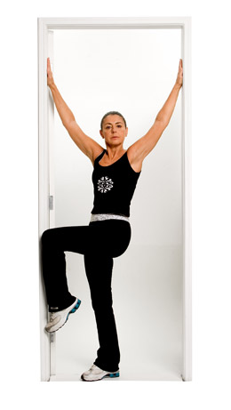 Start with feet together but toes pointed out 45 degrees, arms against the doorframe.